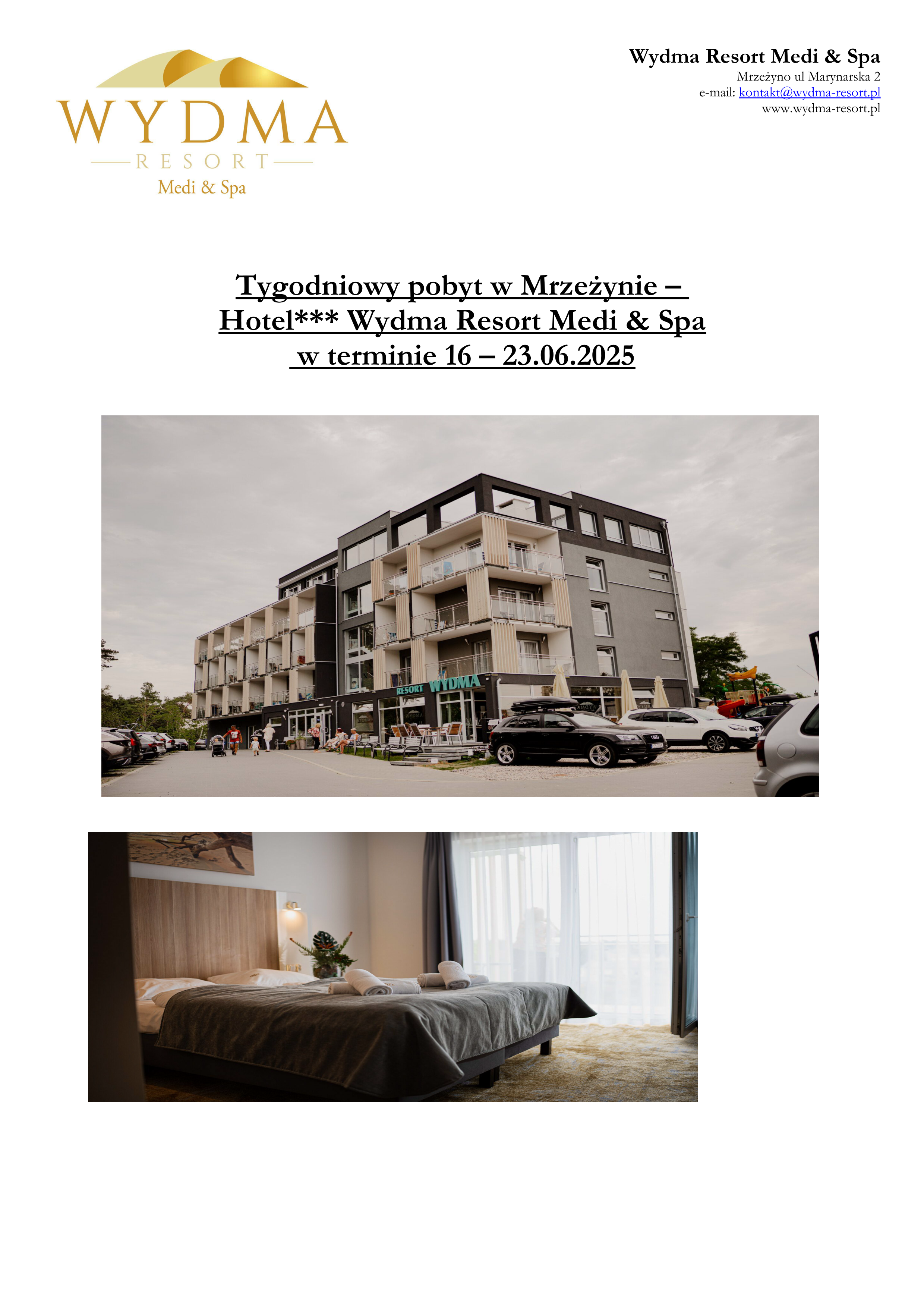 Zapraszamy na tygodniowy wyjazd  do Mrzeżyna w dniach  16-23 czerwiec 2025 r. do hotelu Wydma Resort Medi & Spa.